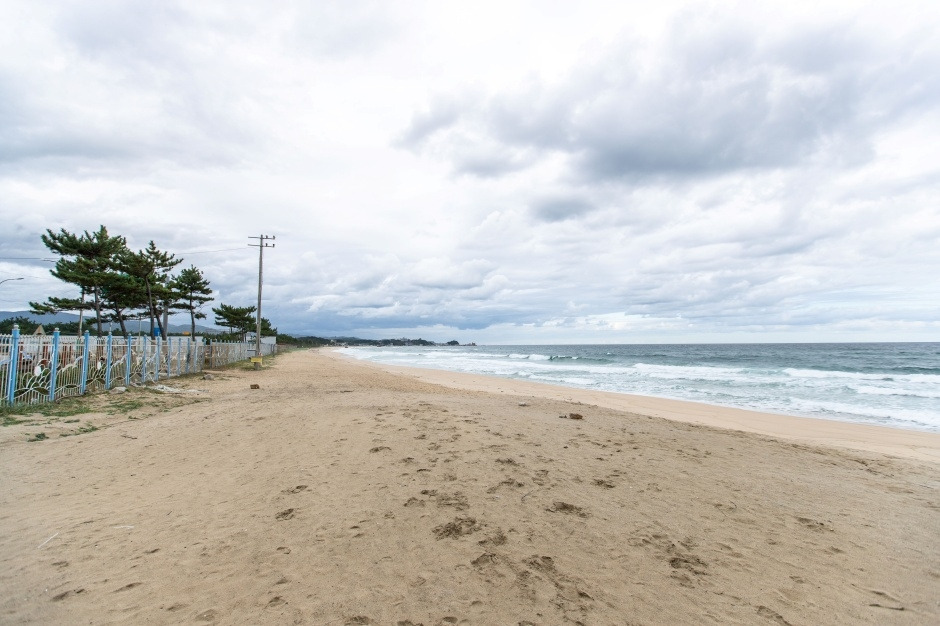 강릉시와 경계지점에 있으며 인근에 남애항이 있어 신선한 해산물과 활어회를 즐길 수 있는 곳이다. 해변 뒤편으로 송림이 울창하고 백사장이 넓고 깨끗하다. 설악권의 최남단 해변으로 양양군 남쪽에 위치하고 있으며 여름에만 한시적으로 지경리 마을에서 운영, 개방하는 간이해수욕장이다. 지경리해변의 최고 장점은 해수욕장 뒤편에 울창하게 드리운 3만 평 정도의 송림이 있다. 이 송림에서 텐트를 치고 야영도 할 수 있다. 해변에서는 파라솔이 필요 없을 정도이다. 더구나 다른 간이해수욕장과 달리 충분한 방갈로 시설이 갖추어져 있어 단체 수련 등에 많이 이용되고 있다. 해안선 길이는 700m 정도로 길게 뻗어 있고 수심도 1m 정도의 얕은 편이다. 해마다 여름이면 기업 단체 연수가 줄을 잇는다.
