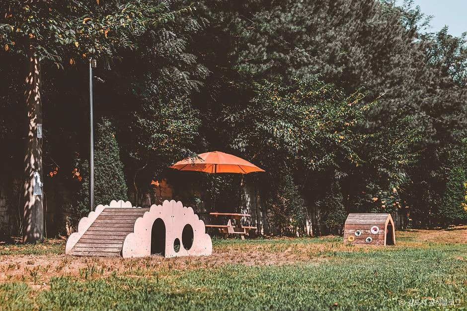 펜스, 안전문, 운동장, 놀이기구, 음수대, 배변장, 격리장, 놀이기구, 벤치와 파라솔 등 비치