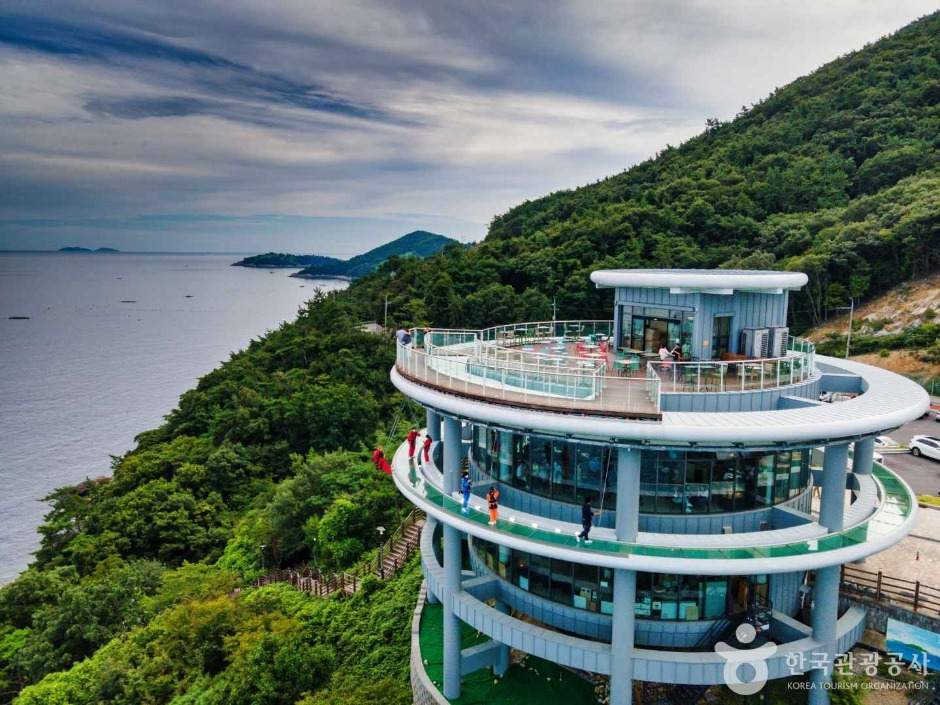 한 점 쉬어가는 공간이 되어주는 물미해안전망대는 자유로운 여행객들의 또 다른 벙커로 인기만점이다. 삼동면 대지포 마을 인근에 조성되었다 하여 지역민들에게는 대지포 전망대라는 별칭으로도 불리기도 한다. 2016년 착공해 2019년 12월 개장했다. 남해바다를 밝히는 등대 콘셉트로 지어진 이곳은 360도 조망이 가능한 원통형으로 ‘하늘 위에 떠 있는 기분’을 만끽할 수 있게 해 준다. 2층으로 구성돼 있으며 1층에는 다양한 품목을 살 수 있는 남해군 특산품 판매장, 2층에는 베이커리 카페와 옥상전망대로 꾸며져 있다.